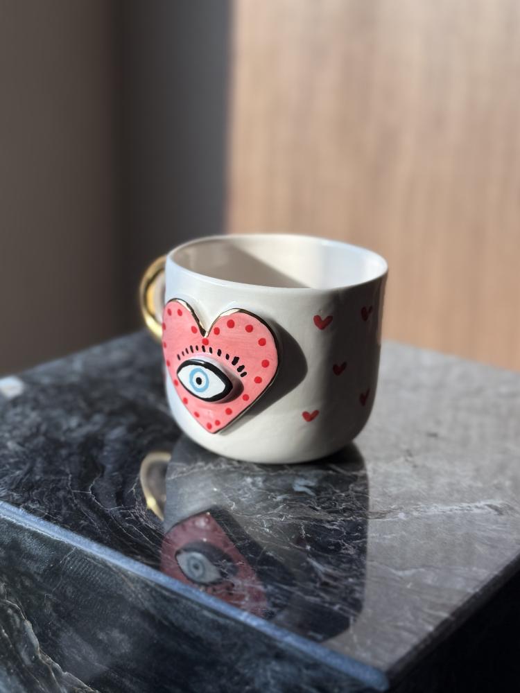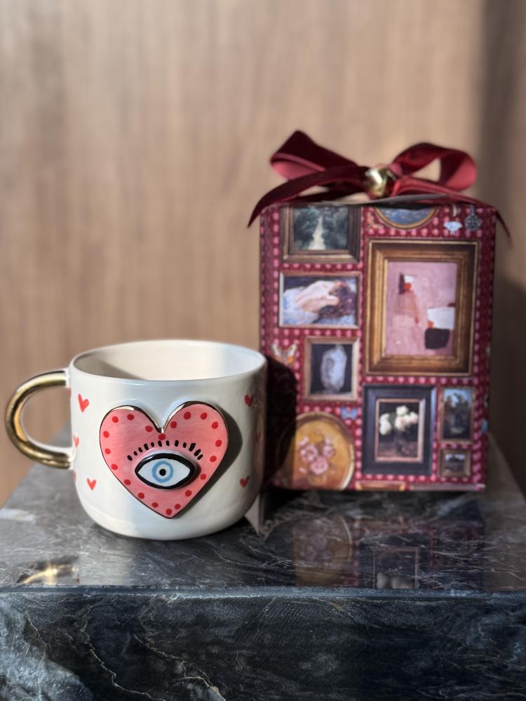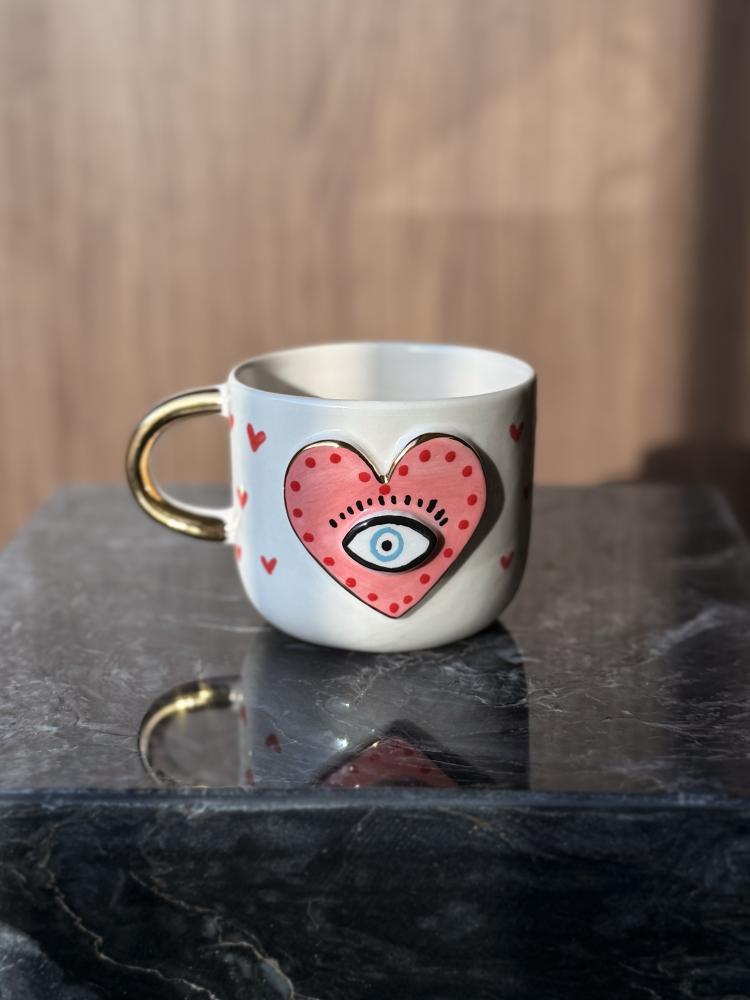 بتصميم قلب أحمر يتوسطه عين بتفاصيل دقيقة مرسومة يدويًا تجعل كل قطعة فريدة .