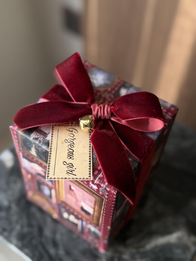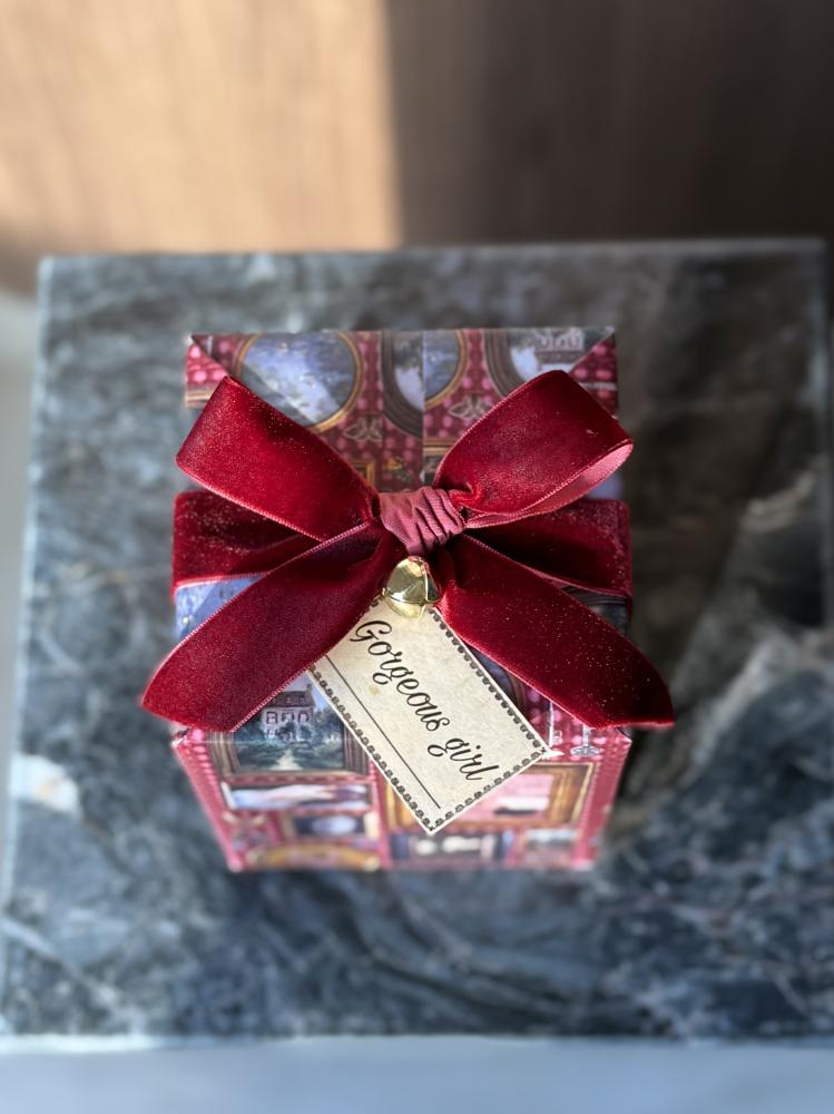 مُزين بشريط مخملي باللون العنّابي، مُعقود ليمنح مظهرًا دافئًا وراقيًا ، جرس صغير ذهبي يُصدر رنينًا خفيفًا يُشعرك بجو الهدايا والاحتفالات ، التاق “Gorgeous gift” رسالة قصيرة مُعبرة تُضفي سحرًا خاصًا عند الإهداء♥️💫.