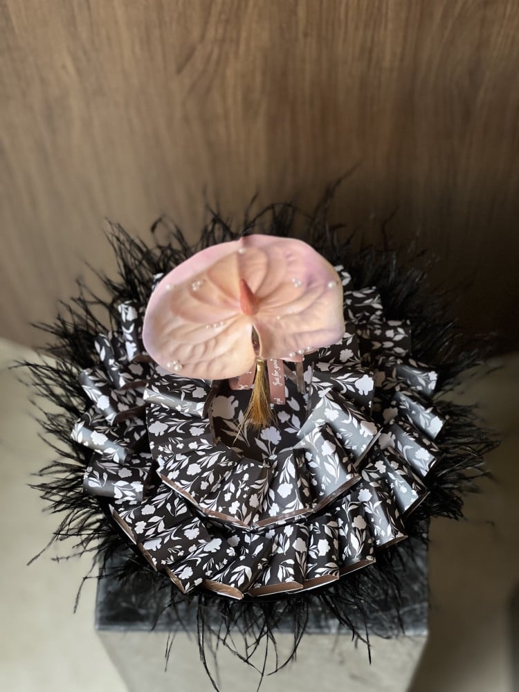 •قاعدة من بلندز باللون الاسود مزينه بريش أسود وورد صناعي جوده عاليه مزين باحجار اللؤلؤ 🪷✨.