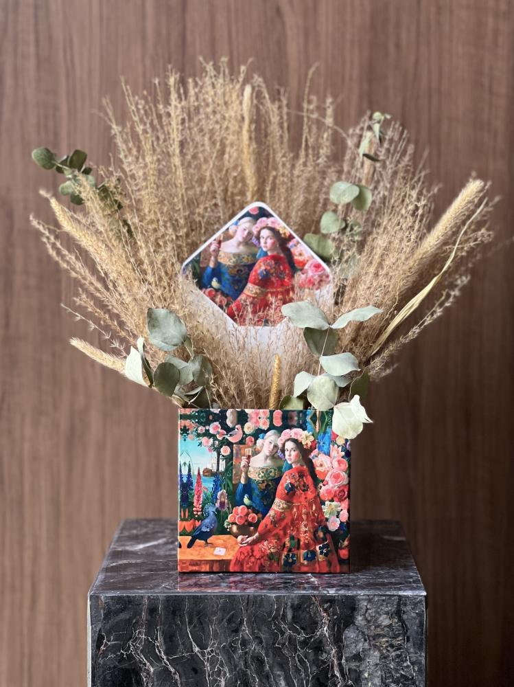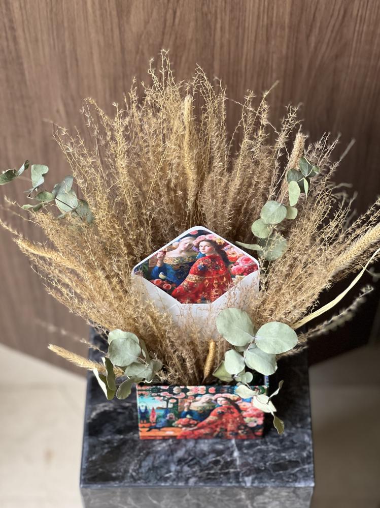أردنا تقديم هديه لتقديم الهدايا الماليه بقاعده مميزه وكرت اهداء متناسق مع القاعده وتنسيق ورد طبيعي مجفف