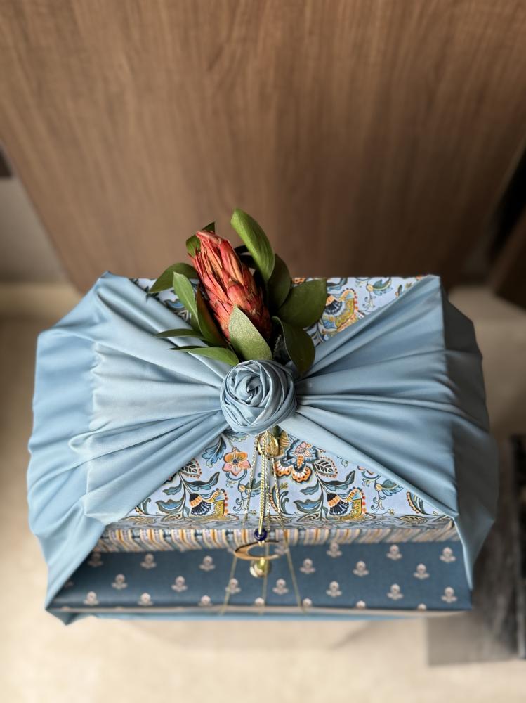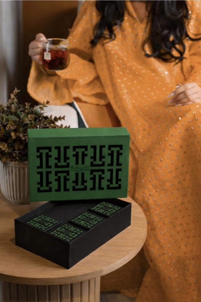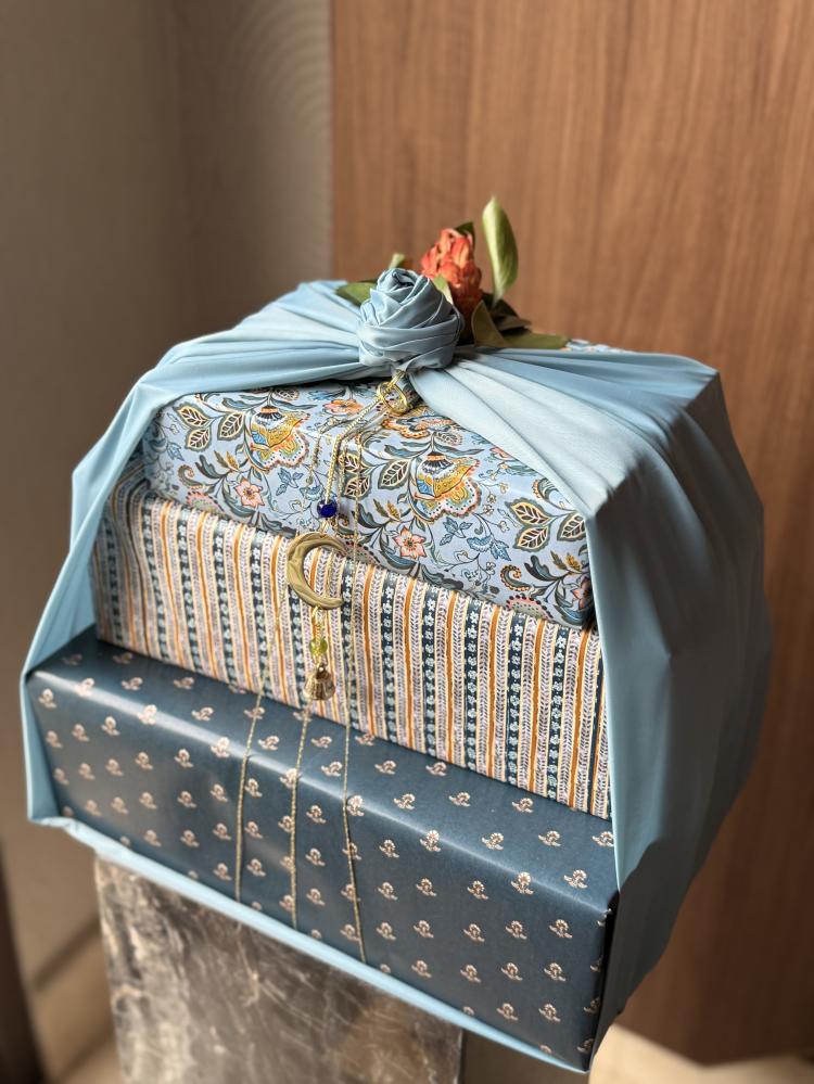 دون رمزية مباشرة لتبقى صالحة للاستخدام طوال العام واكتملت الهدية باختيار مجموعة شاي تناسب ذائقة الجميع , استُلهم التغليف من جمال الفني الهندي بدمج نقوش متعددة بروح لونية واحدة وأُكمل بالقماش والورد المجفف ليحمل إحساس الهدوء والدفء معًا 🌙✨